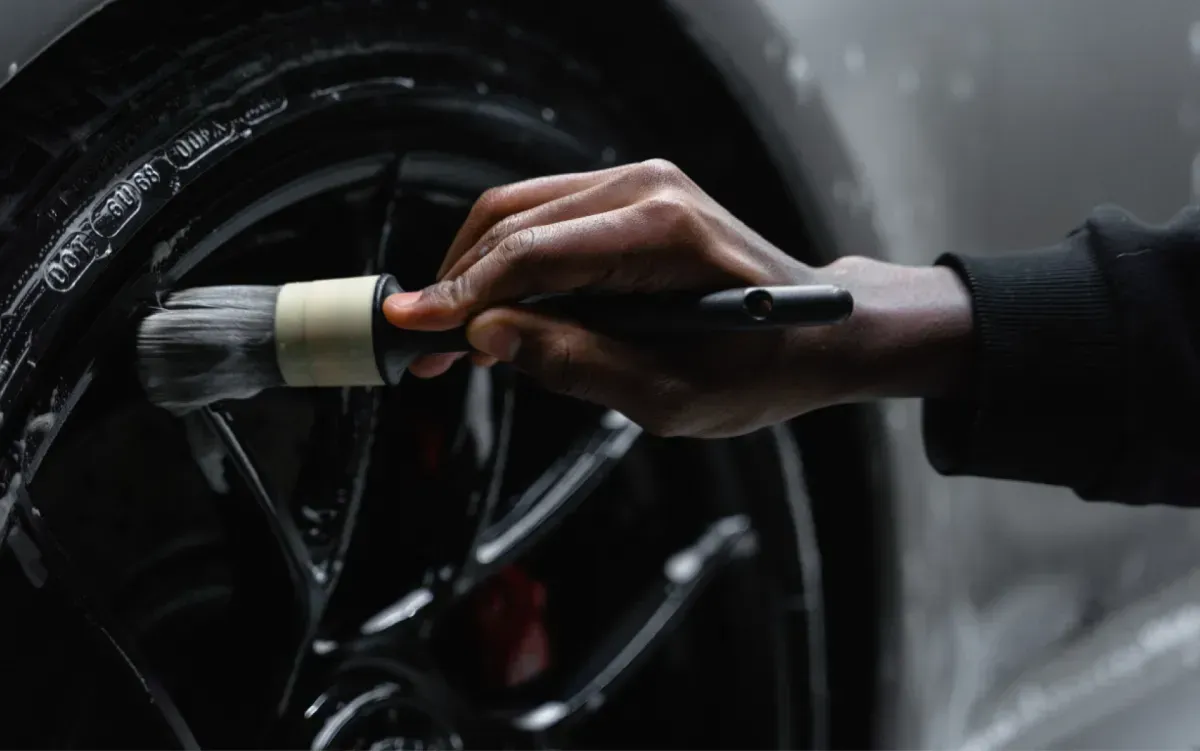 Deep cleaning of wheels, wheel wells, and tires, including brake dust removal and tire dressing for a showroom-quality finish.